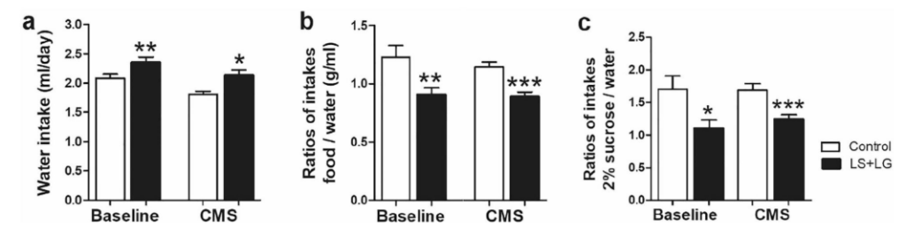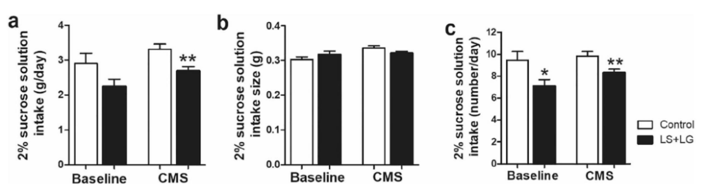 图3.LS + LG对小鼠在CMS之前和期间摄入2%蔗糖及其模式的影响。每日蔗糖摄入量(a),每次摄入量的大小(b)和摄入次数(c)