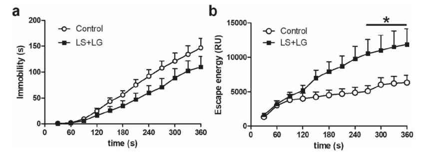 图7.在接受LS + LG或0.9% NaCl溶液作为对照的小鼠中,CMS期间的悬尾试验。TST中的不动时间(a)和逃逸能量(b)